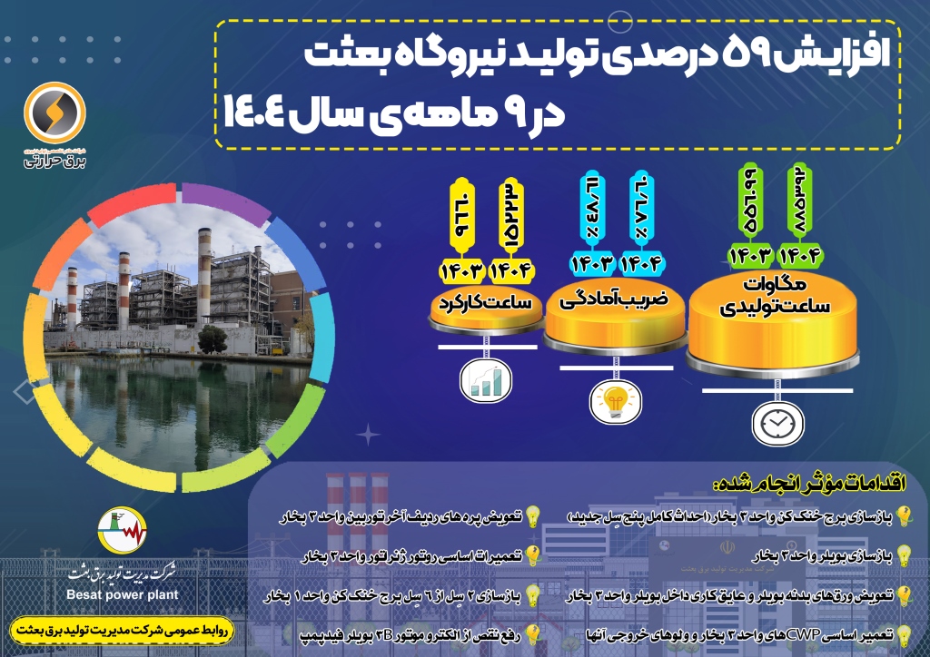 اینفوگرافیک تولید انرژی طی نه ماهه نخست سال ۱۴۰۴ در نیروگاه برق بعثت